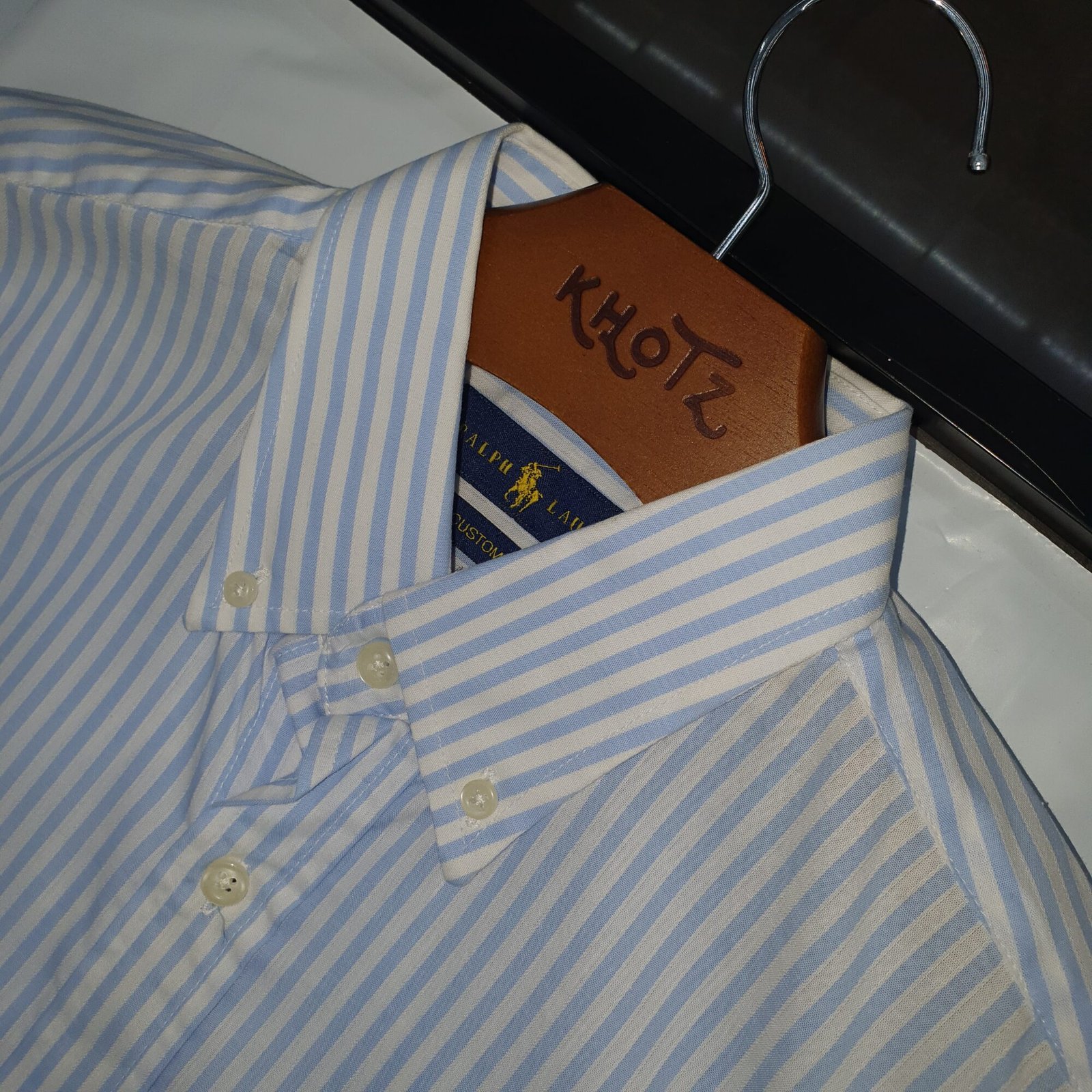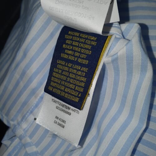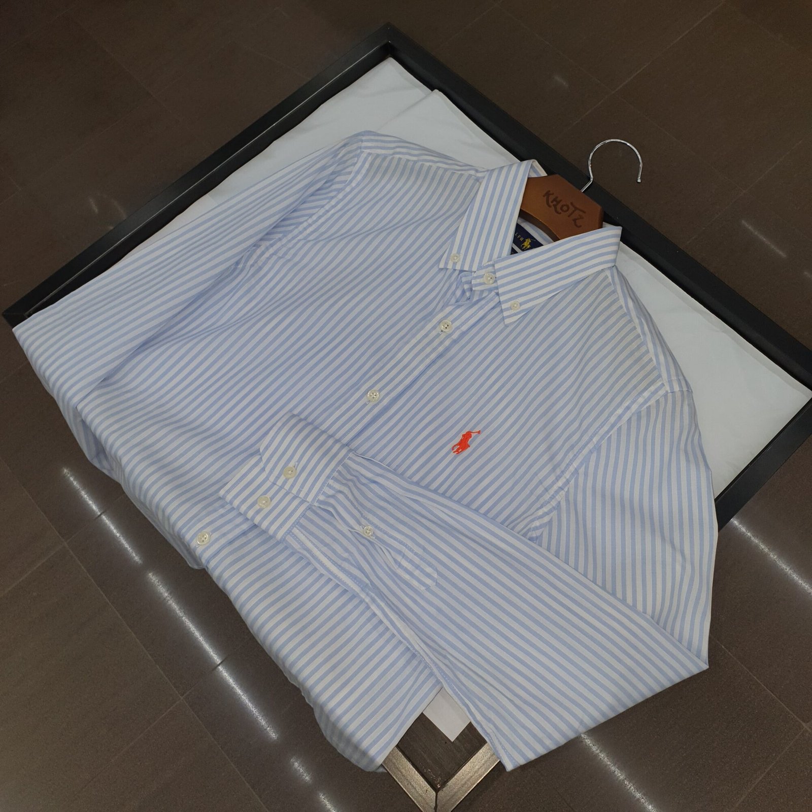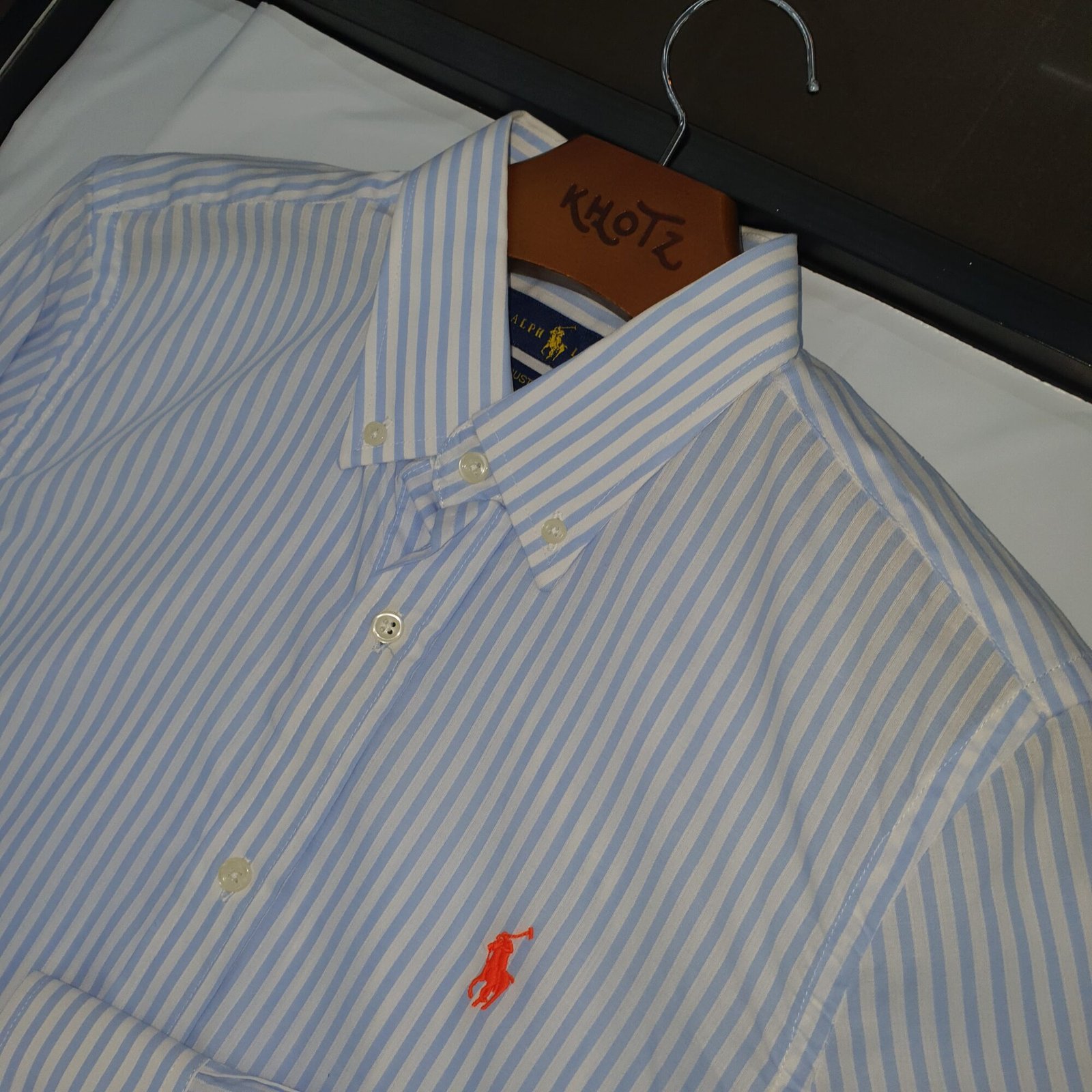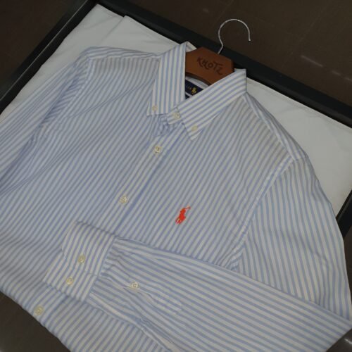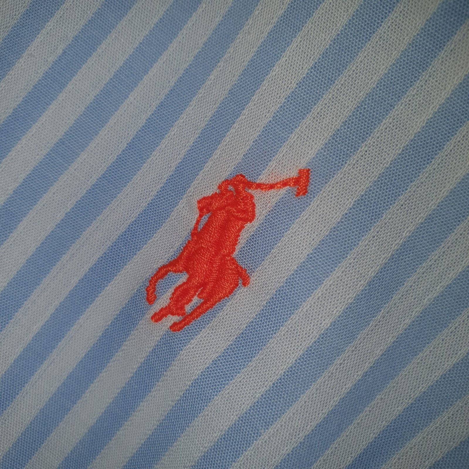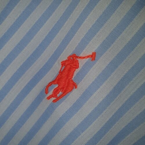 O tom azul bebê, suave e luminoso, combinado ao clássico padrão de listras Americanas, cria um visual clean e refinado, enquanto o bordado Pony Laranja adiciona um contraste delicado e contemporâneo, reforçando a identidade icônica da marca com personalidade.