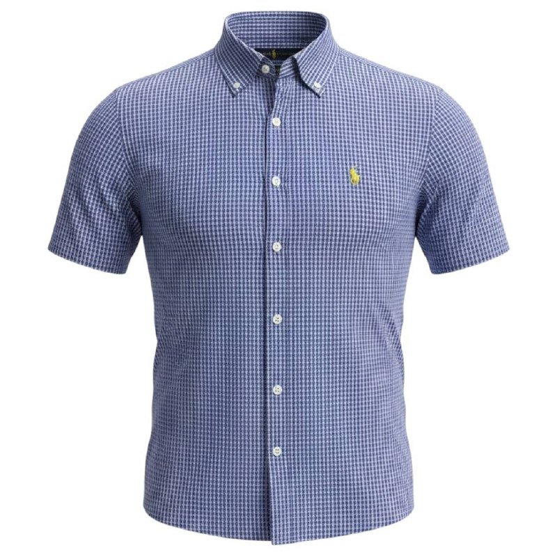 Camisa Ralph Lauren Masculina Manga Curta Micro Xadrez Azul Royal Pony Limão