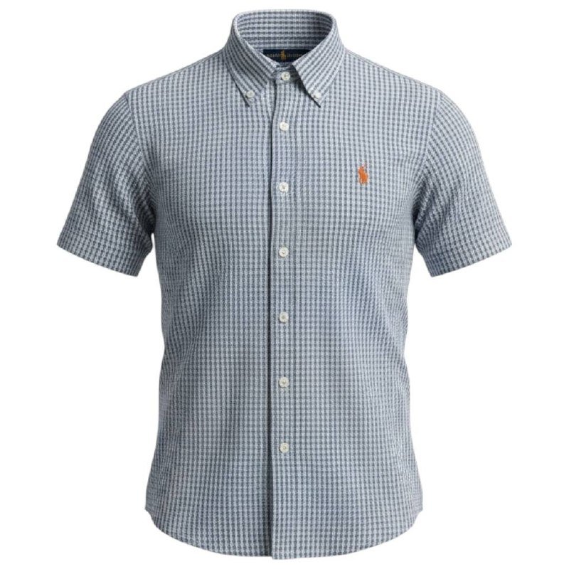 Camisa Ralph Lauren Masculina Manga Curta Micro Xadrez Cinzento Pony Laranja