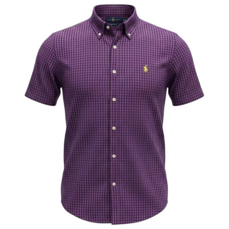 Camisa Ralph Lauren Masculina Manga Curta Micro Xadrez Roxo Pony Amarelo