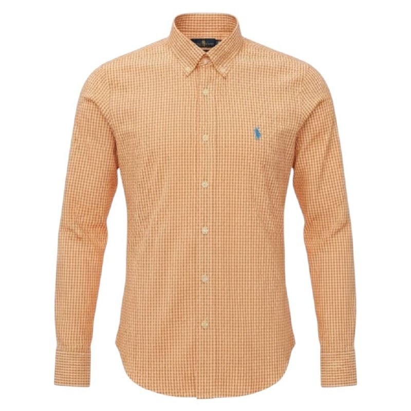 Camisa Ralph Lauren Masculina Micro Xadrez Laranja Pony Azul Celeste