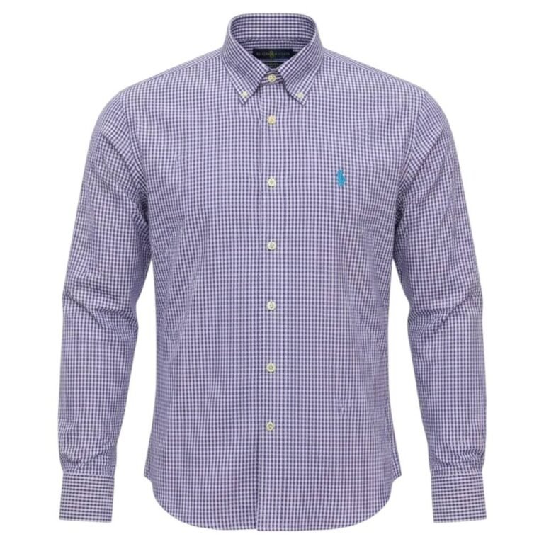 Camisa Ralph Lauren Masculina Micro Xadrez Lavanda Pony Azul Celeste