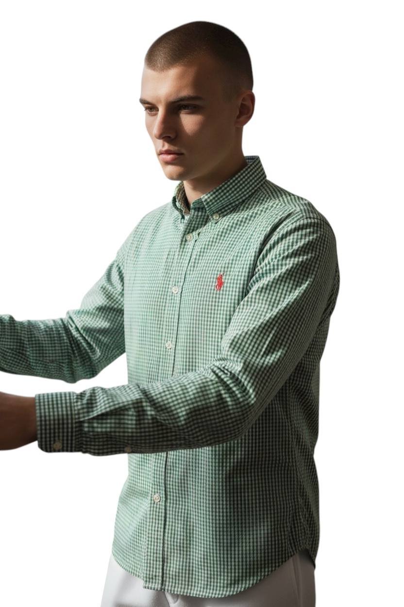 A Camisa Ralph Lauren Masculina Micro Xadrez Verde com Pony Vermelho combina personalidade marcante e sofisticação clássica em uma peça de presença forte e elegante. Confeccionada em algodão de alta qualidade, proporciona toque macio, ótima respirabilidade e caimento impecável. O micro xadrez em tom verde transmite vigor e refinamento, enquanto o bordado Pony Vermelho cria um contraste vibrante e icônico, destacando o DNA tradicional da marca com um toque de ousadia.