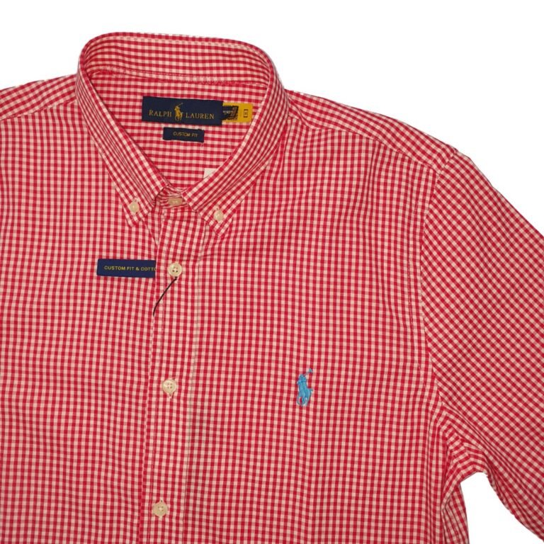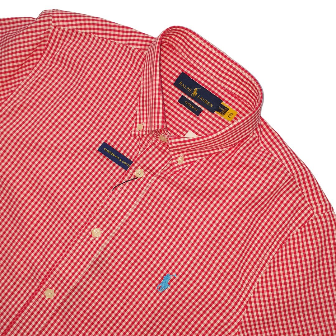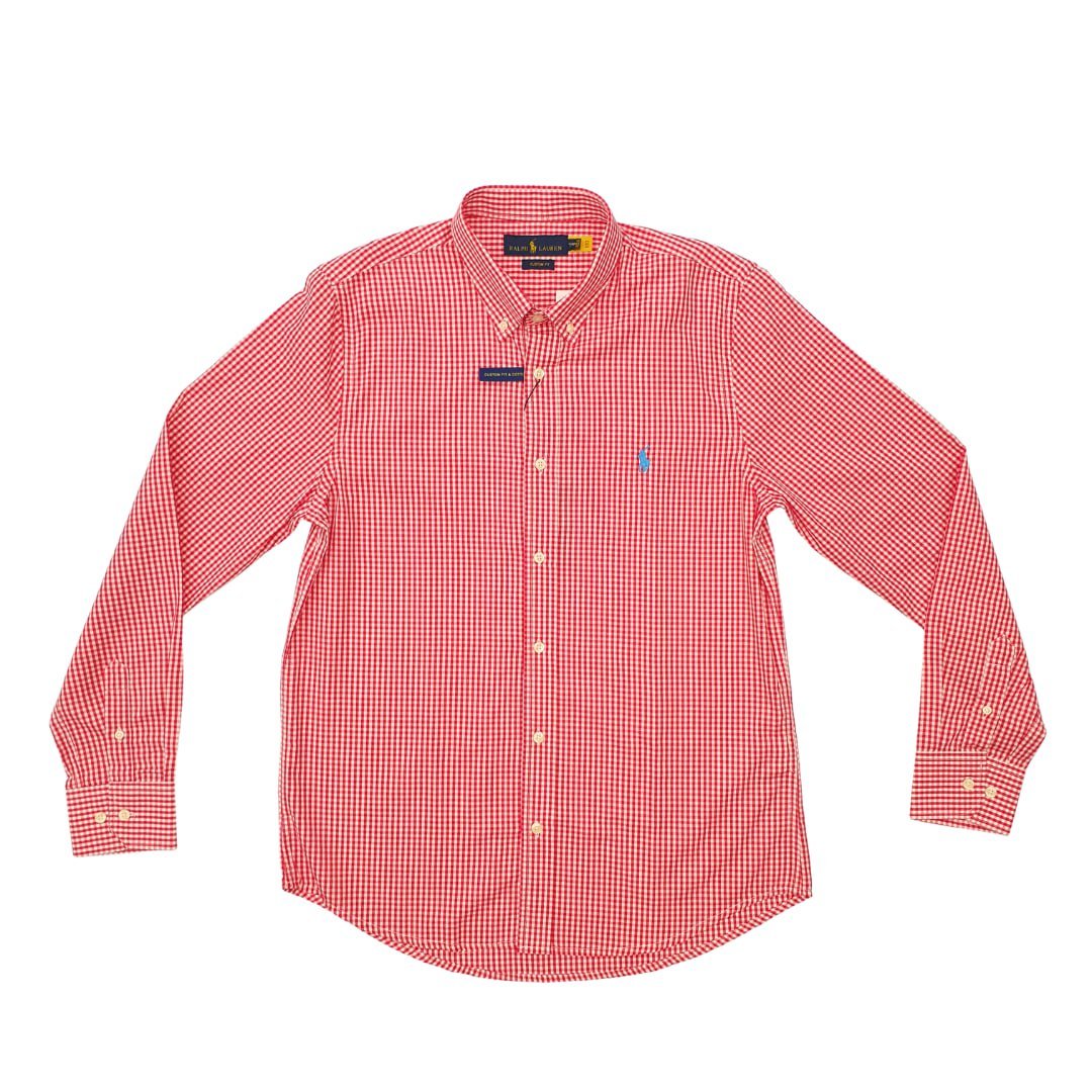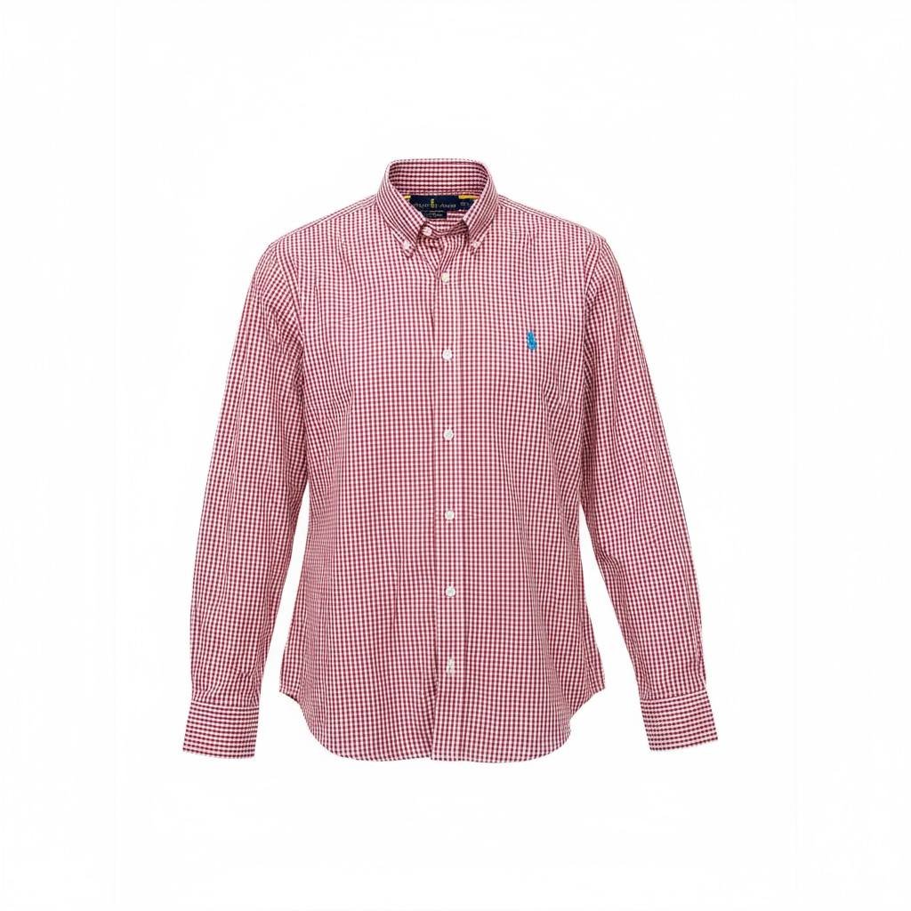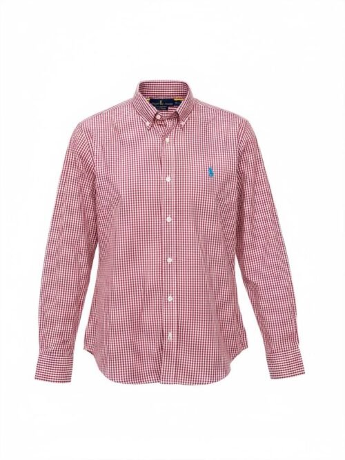 Estampa micro xadrez vermelho com o bordado do Pony azul celeste — identidade Ralph Lauren inconfundível.